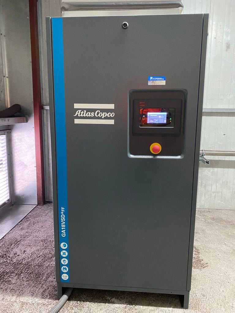Después de que nuestros técnicos comerciales realizasen un estudio energético personalizado y valorasen las mejoras que se pueden llevar a cabo para reducir costes, se procede al cambio de compresor todo-nada del cliente por un compresor Atlas Copco de velocidad variable GA 18 VSD+FF.