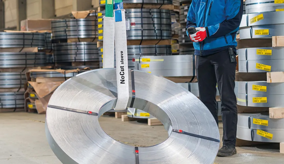 Protección anti-corte 𝐍𝐨𝐂𝐮𝐭® de Spanset utilizada como funda, protege las eslingas de los bordes afilados de la carga .